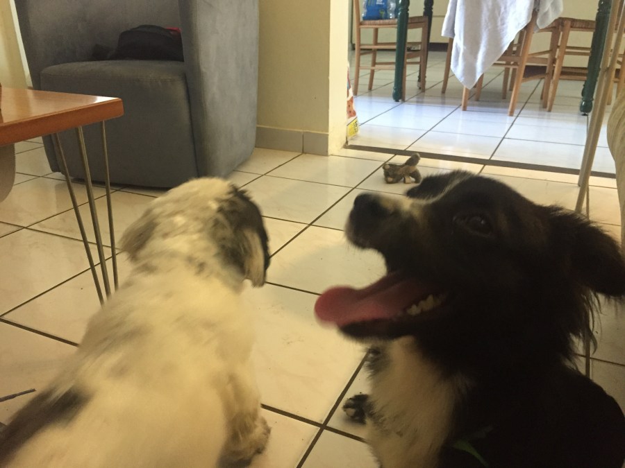 Lego seems to like his new home, owner and brother, even though he has a completely different personality. While Robin is a hyperactive dog, he has to be where the people are, needs to get attention and loves running around; Lego is a very relaxed dog. He does not run around life crazy Robin but like other dogs he does like attention and wants to be with people. I think they’re becoming friends as I saw they’re interactions with a new toy Lego was playing with. Lego was playing with the toy and Robin wanted to have it, because if someone else has something, he obviously wants it. With their short attention span, Robing would quickly forget about it when he heard the smallest sound, so Lego would move on. Then Lego would gently put it on the ground to come back to it later while he went to look at something else, and while he was away Robin would grab the toy. Of course Lego came back and found Robin playing with his toy and that’s when the fight would start.