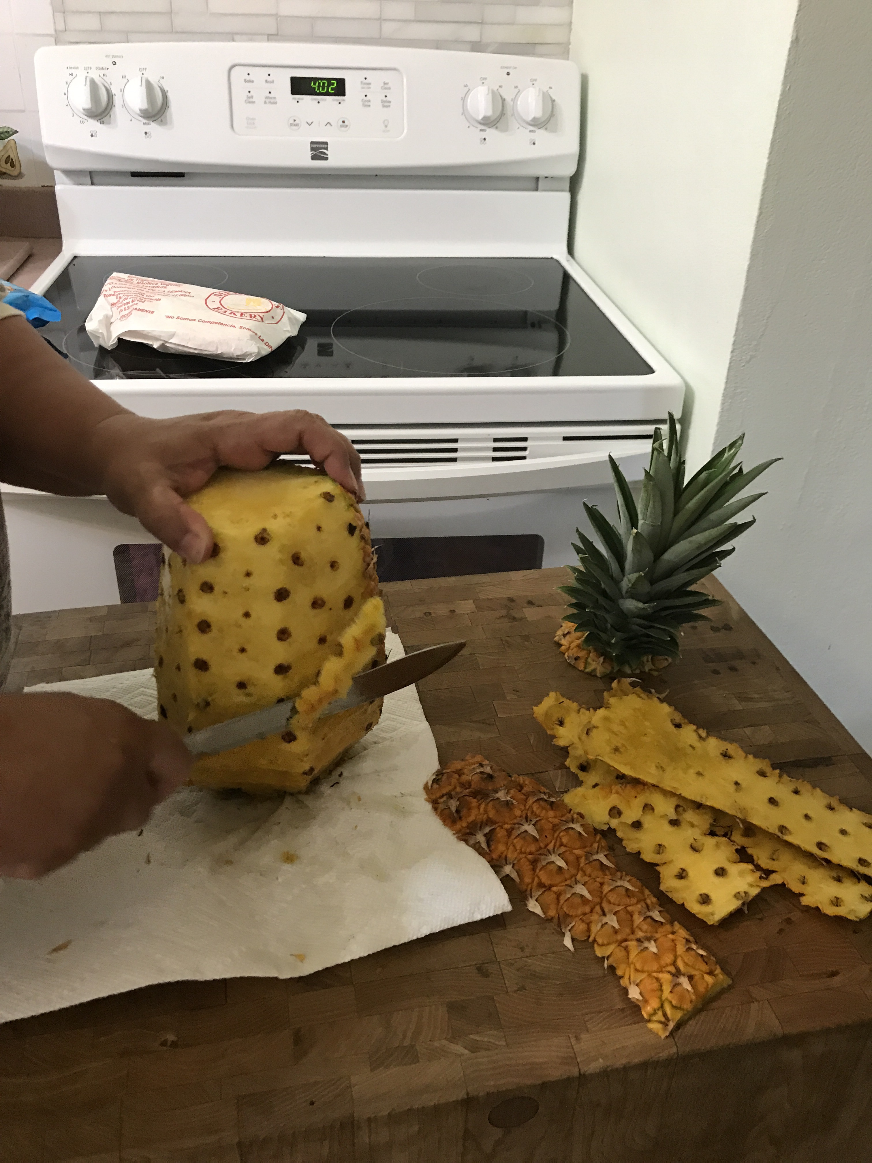 Yesterday I learned how to cut a pineapple we would use today to make Piña Colada. I told her we had to make it when she bought two pineapples on this weekend, but by we I meant you ( my aunt, Titi Marta), so we made it today for Father’s Day. I had never done that in my life, and I informed her (Titi Marta) that I have never even eaten a pineapple, I just like Piña Coladas, but she said she would teach me how to make it.
