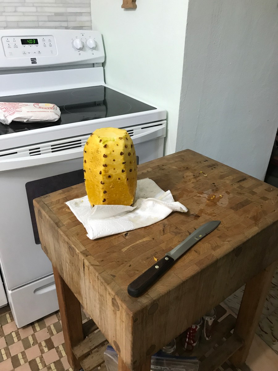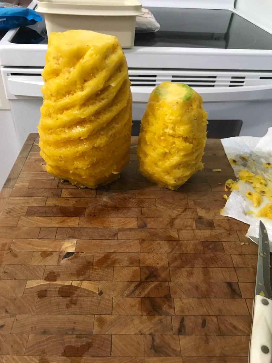 As she demonstrated I was just afraid I would cut my fingers off when I did it, but thank God I didn’t. There was no blood or any accidents but my pineapple didn’t look as nice and professional as hers, mine looked like a child had removed the eyes.