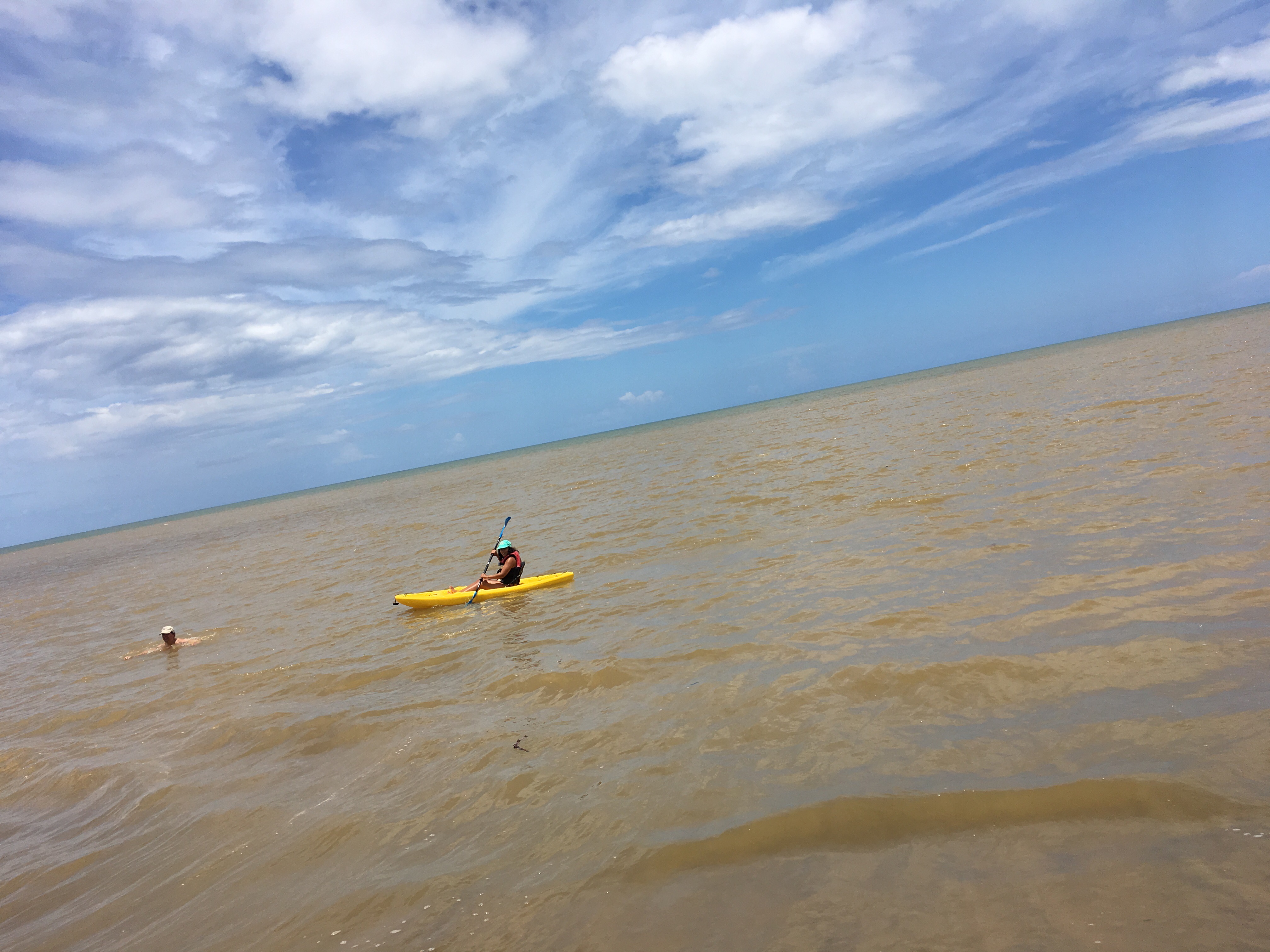 So after being able to get on, which was not easy because of the waves, we started paddling, my mom, stepdad and I. They were both ahead of me as I was trying to get the hang of it and get comfortable in the kayak. By the time I really started paddling, I was the last one, they had both gotten ahead of me, so I started to paddle faster. Before I knew it, I was able to catch up and I wasn’t even tired yet.