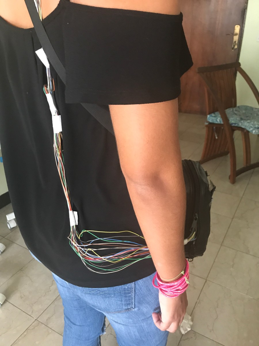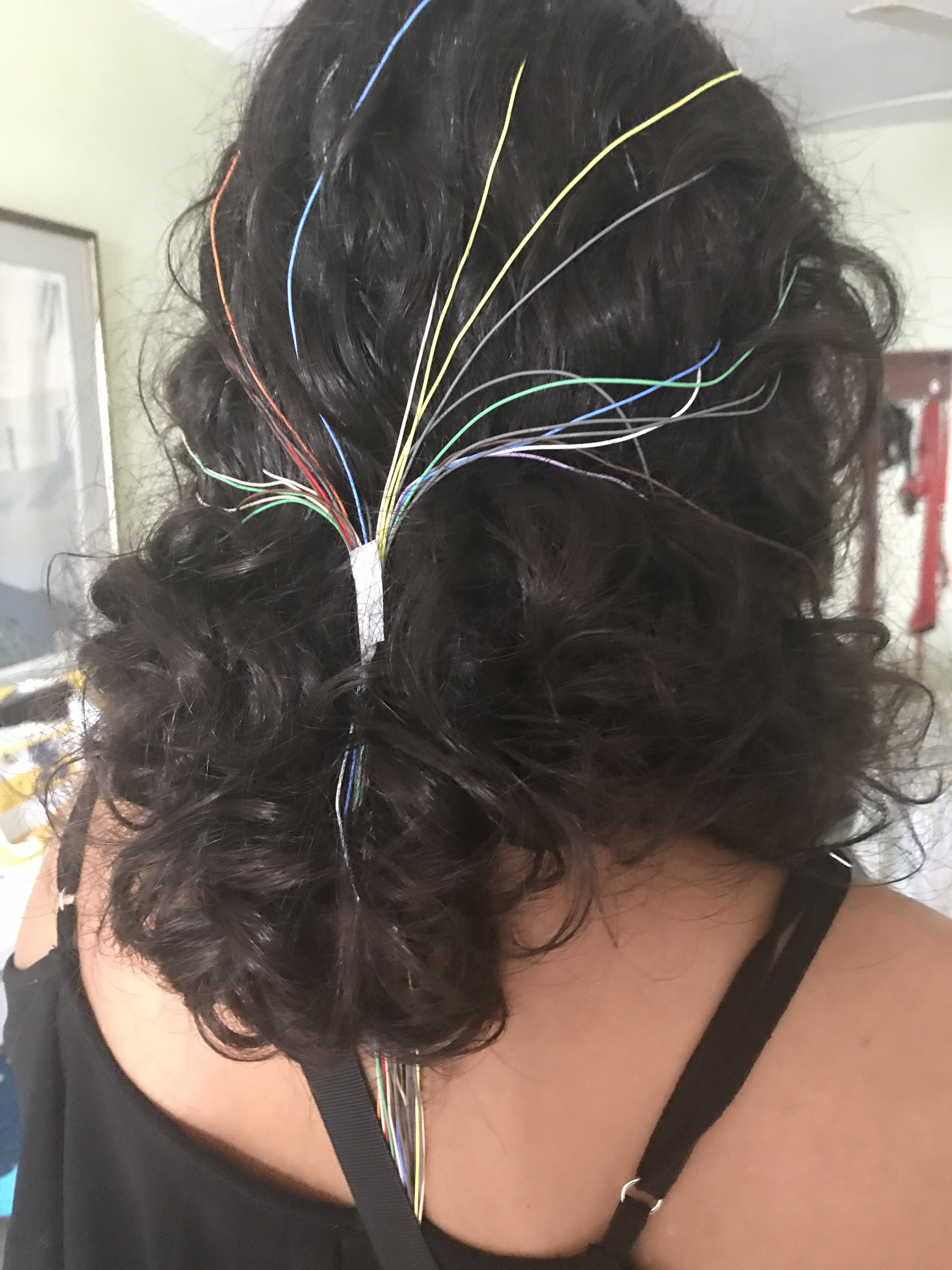 Like I said yesterday, today I was getting an EEG. I had 24 electrodes glued and taped to my head. These are all connected to a recorder that I’m have to carry around like a purse, except it’s not really that cute. Each of the cables from the electrodes is a different color and that’s actually pretty cool.