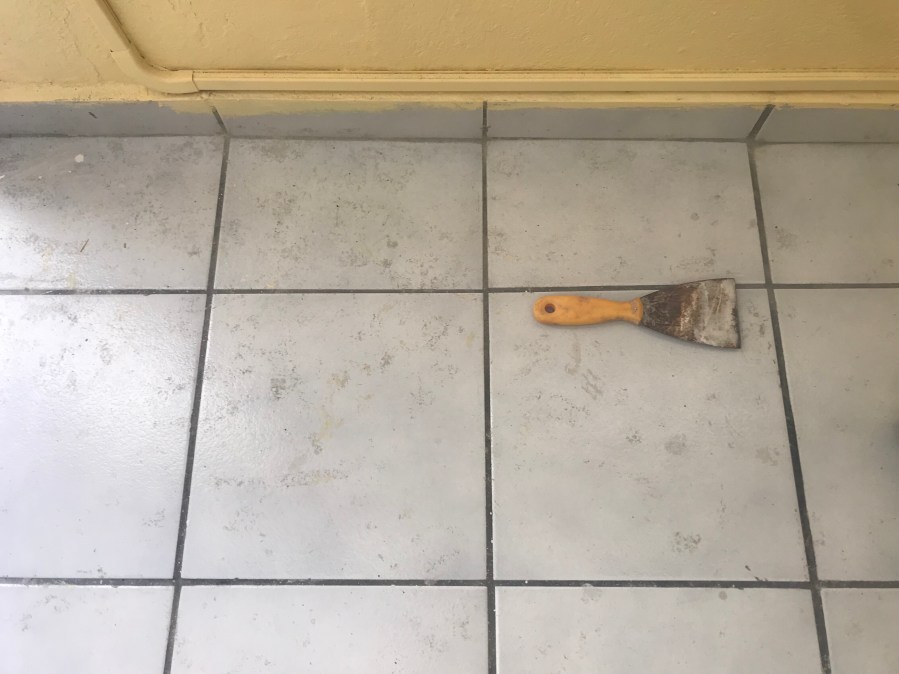 Today, between my grandpa and me, we were able to clean most of the floor tiles. I attacked the paint stains, he took those old dirt stains and I swear it looks like we put in new tiles. But as happy as I am with the results, I don’t want to think about having to do that again in my room and I know we’re going to have to after the bathroom is done and they take all the stuff that is going in the bathroom out.