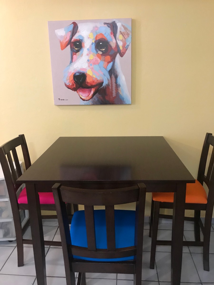 It’s not that big, which is perfect because I don’t need a big table, it’s just me. I just needed a table for four people in case a have friends or family over and it’s tall so my dogs can’t eat food off my plate; they will try, but they won’t reach.