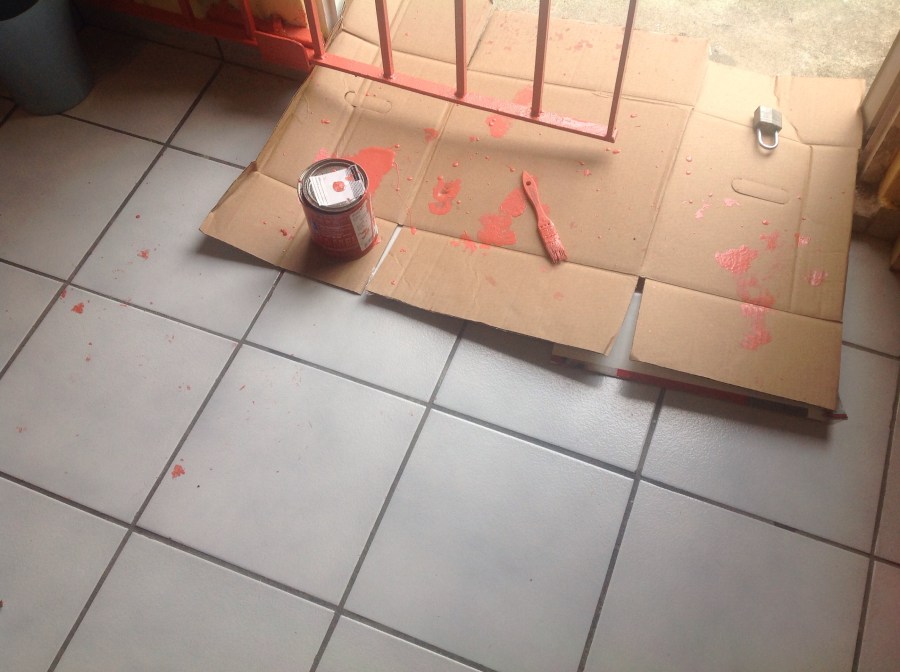 But when I decided to do this I thought it would be more or less like painting a wall because I thought it was the same kind of paint. When I started to paint today I realized that I was using oil based paint instead of water based paint which we used on the walls. Oil based paint lasts longer and is used for things that take beatings, like furniture, doors and gates.