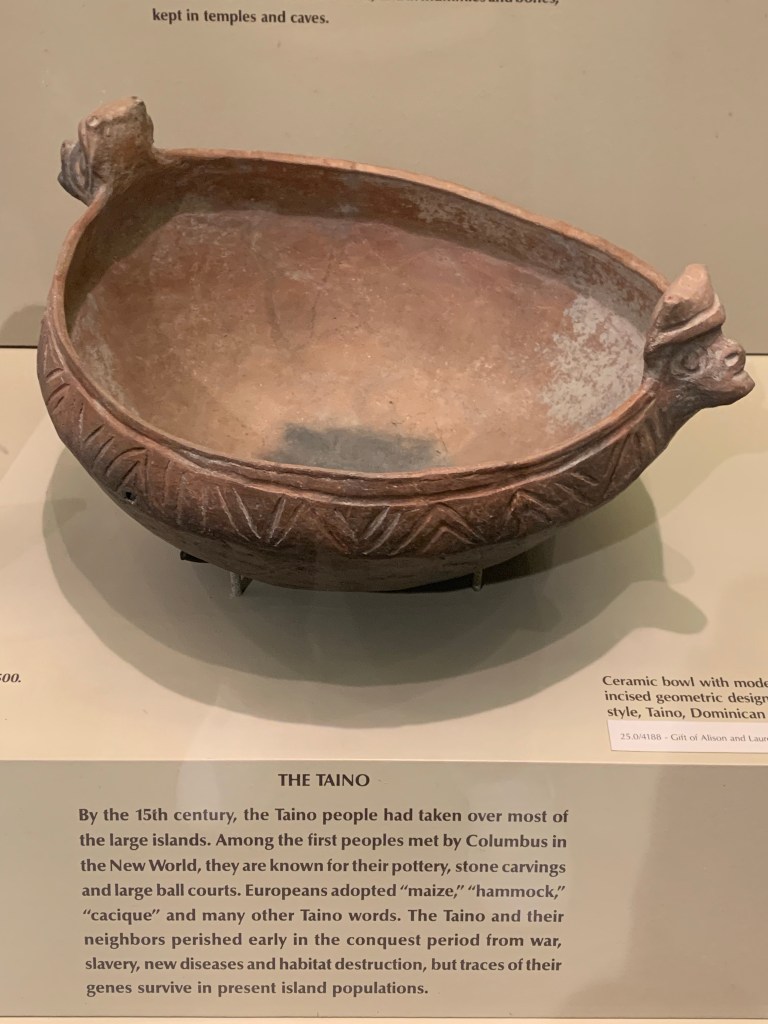 I think my favorite part of the museum was the exhibit where they had three Taino artifacts. The Taino were the indigenous people of Puerto Rico and the Dominican Republic, who were settled here before the Spanish came to the New World. These tree artifacts were a Yuke, Dujo and ceramic bowl. The Yuke was a decorated stone or wooden belt used to bounce the batú or ball during the game of Batú. Dujo was the wooden or stone ceremonial bench for the Cacique (chief). The last one was a bowl made by the Taino in the Dominican Republic.