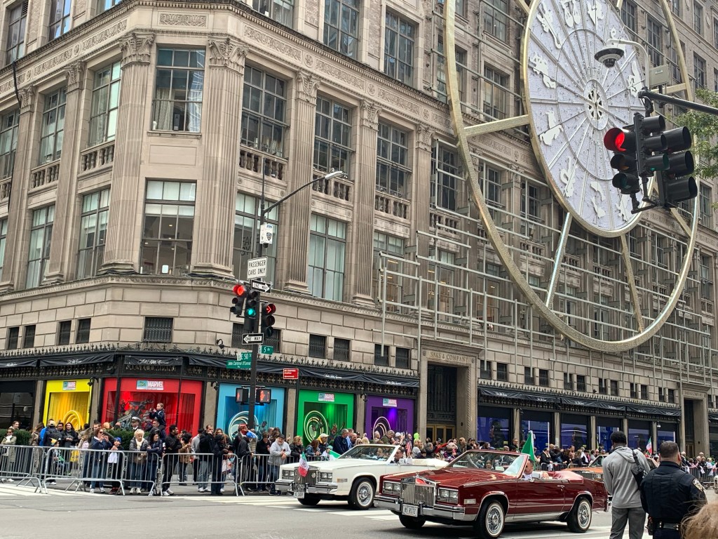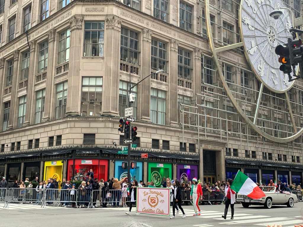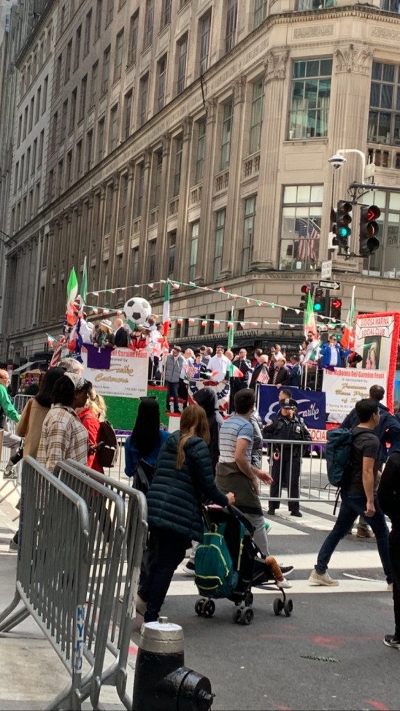 When we were walking back to get lunch, we got stuck trying to cross Fifth Avenue because of the Columbus Day Parade.. We were not there long until the let us cross the avenue, but we saw a marching band, a Cadillac Club, a social club.