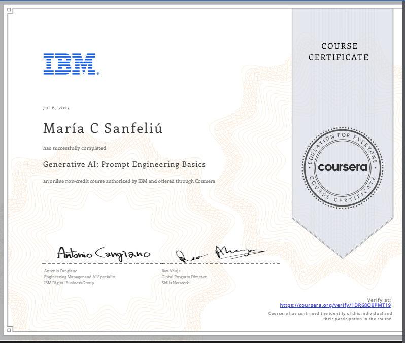 The course I just finished was on creating Prompts to get the correct response. This course was very interesting because it made a lot of sense to me, they were speaking my language, writing. This is a very important part of AI, writing clearly what you want or need, so it can give you the results you’re looking for.