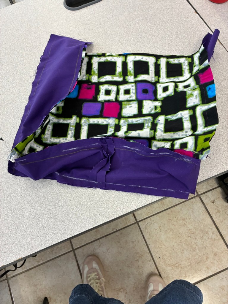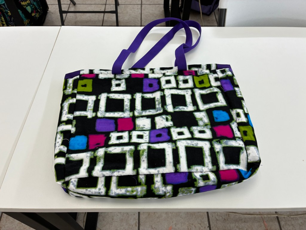 We were told last week in sewing class that most of us would finish our bags this week; I was sure some people would but I didn’t think I would be one of them. It just seemed like I still had so much to do that three hours wouldn’t be enough. I felt really far behind everyone else because I couldn’t find some of the fabric I had already cut out for the inner lining of the bag and I was still struggling with sewing straight lines.