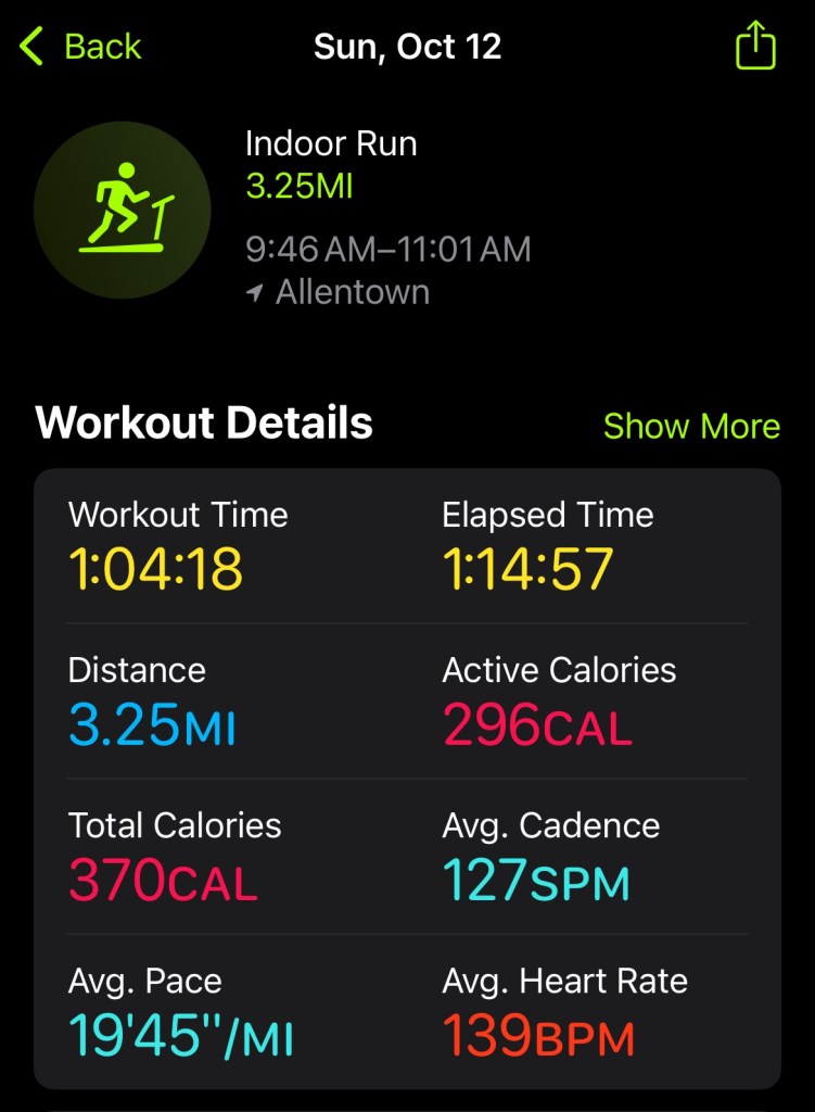 I’m usually able to silence and distract myself from everything around me with music while I run. This time I couldn’t get away from anything or anyone, so I kept getting distracted. When I got to 3.25 miles, I was ready to be done; I wasn’t tired, I could keep running. I was just so bored of looking in front of me and seeing the same thing.